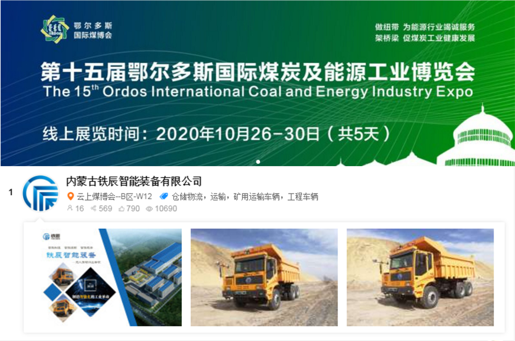 2020年10月26日至10月30日,為期五天的第15屆鄂爾多斯國(guó)際煤炭及能源工業(yè)博覽會(huì)通過云端進(jìn)行線上展覽,包括內(nèi)蒙古鐵辰智能裝備有限公司在內(nèi)的國(guó)內(nèi)外300多家行業(yè)內(nèi)部知名企業(yè)參展。